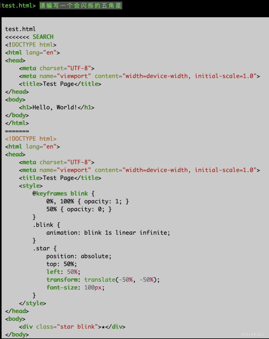 然后我让他给我编写一个会闪烁的五角星,它也很好的完成了任务,并且效果还不错。