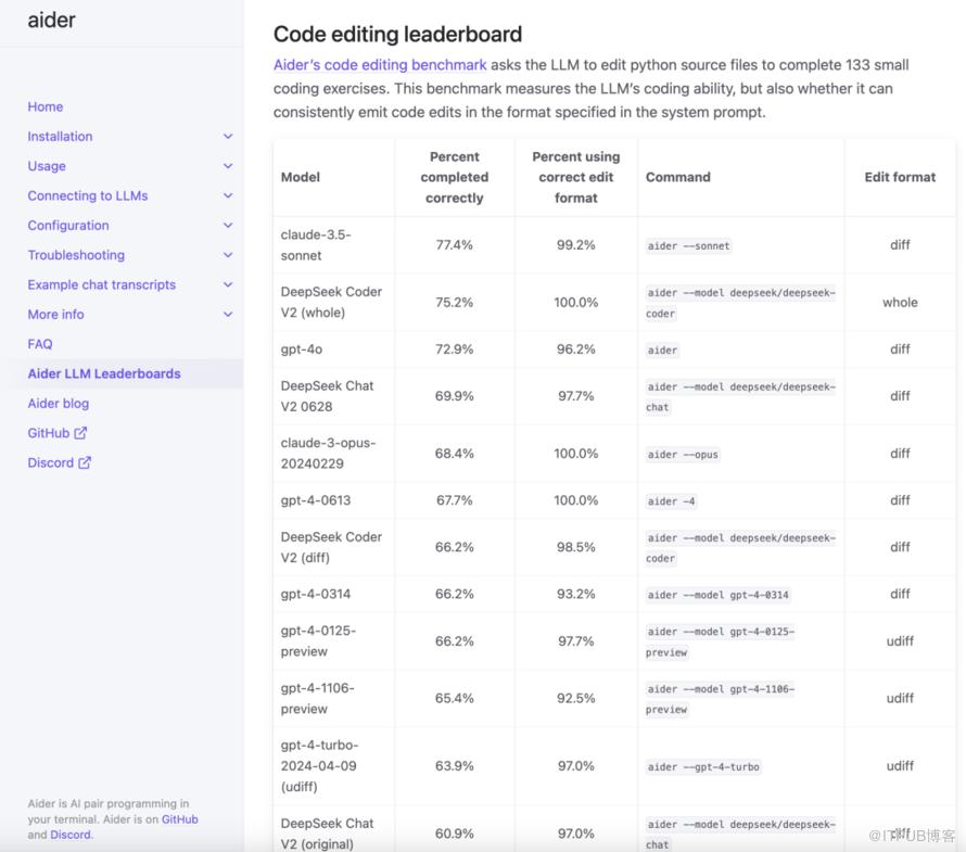 pip install aider-chat项目可以连接一些外部公开的大模型,比如GPT-4o、DeepSeek Coder、sonnet等,并给出了Code editing leaderboard的排行,告诉你最推荐用哪些,大家可以参考下。