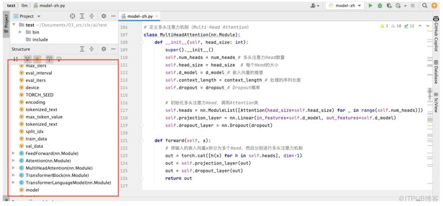2、写代码其实并没有大家想象的那么困难,不过确实也花了好几天去研究,里面一些算法的公式,我现在也记不住,但是由于Github Copilot(我开发工具用的PyCharm,安装的Github Copilot插件)的加持下,只要你思路清晰,参考Transformer架构图,知道需要预先定义哪些参数,都需要定义哪些类和函数,每一步输入什么,经过处理,输出什么,通过写代码注释的方式,代码都会帮你生成的差不多,而且80%以上都是正确的,不需大改。