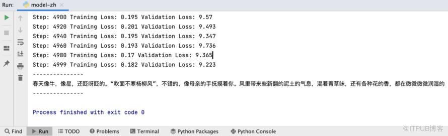 上图是我拿朱自清的《春》作为训练数据,训练迭代了5000次,拿我的mac电脑(2.6 GHz 六核Intel Core i7,16 GB内存,显存6G)跑了大约20多分钟吧,输出的结果。(训练过程中mac耗电很快,cpu一直高负载),并且已经将训练损失值降到了0.2左右(正常2左右即可,因为太低的话会过于拟合,太高的话输出结果不准,一般2左右ok)