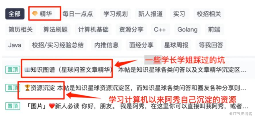前年和去年分享的很多校招上岸经验也都是出自阿秀的学习圈中的往届上岸人如21届、22届、23届等,阿秀的学习圈中置顶帖的「知识图谱」和「精华区」中有很多计算机大学本科&研究生学习以及校招的内容和问题,都是往届沉淀下来的瑰宝。
