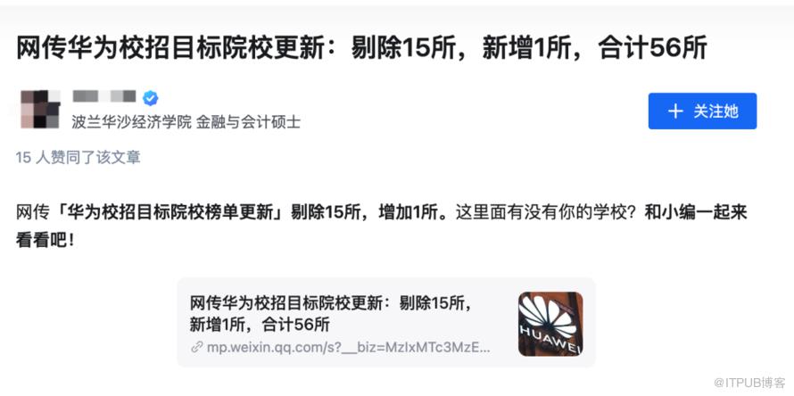 我随便点开一篇名为"网传华为校招目标院校更新:剔除15所,新增1所,合计56所"的文章