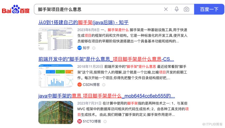 某种意义上你可以把这个项目理解为正式项目的前置部分,或者是基架项目。脚手架项目在百度上的搜索结果如下: