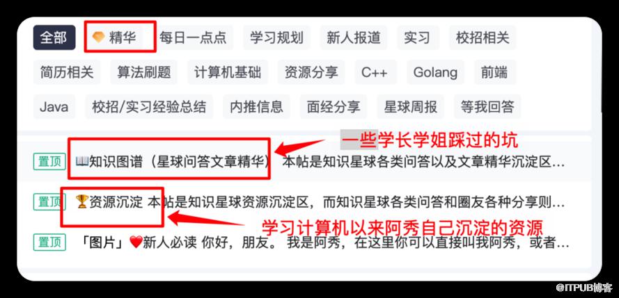 如果可以的话建议你多看看他们踩过的坑,阿秀自己组建的学习圈置顶帖中有个「知识图谱」和「精华区」(如下图),其中有很多计算机大学四年学习以及校招的内容和问题,多看看这些能够帮你走的更稳、更顺。