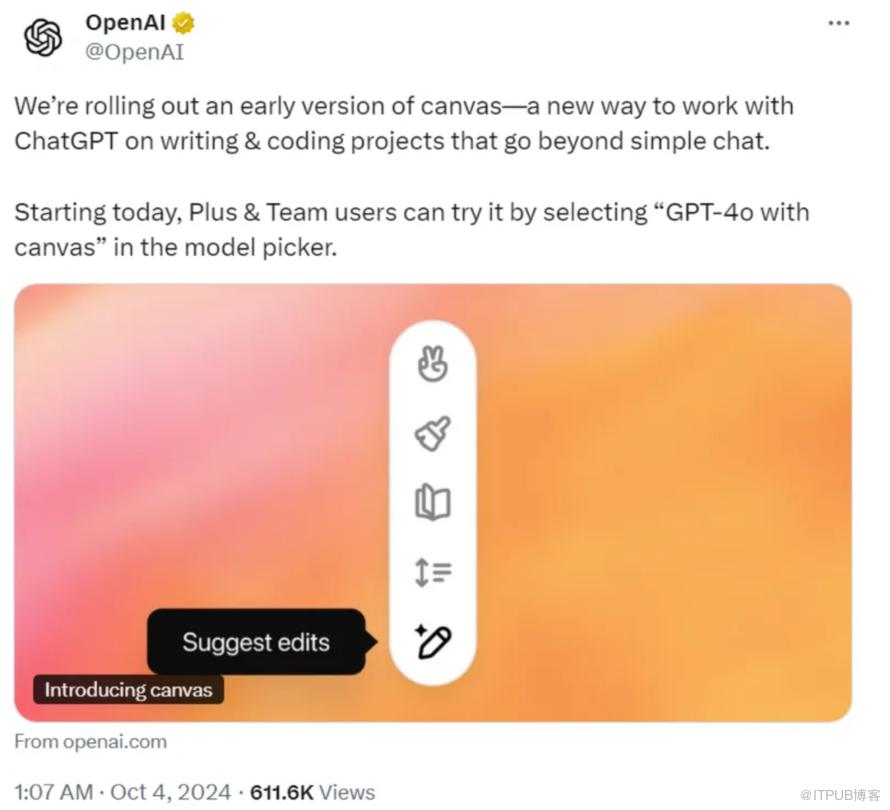 canvas 由 GPT-4o 支持,在 Beta 期间可以在模型选择器中手动选择。不过,现在 Beta 版本只提供给 ChatGPT Plus 与团队用户。企业和教育用户将在下周获得访问权限。ChatGPT 免费用户需要等到 canvas 正式发布后才能使用。