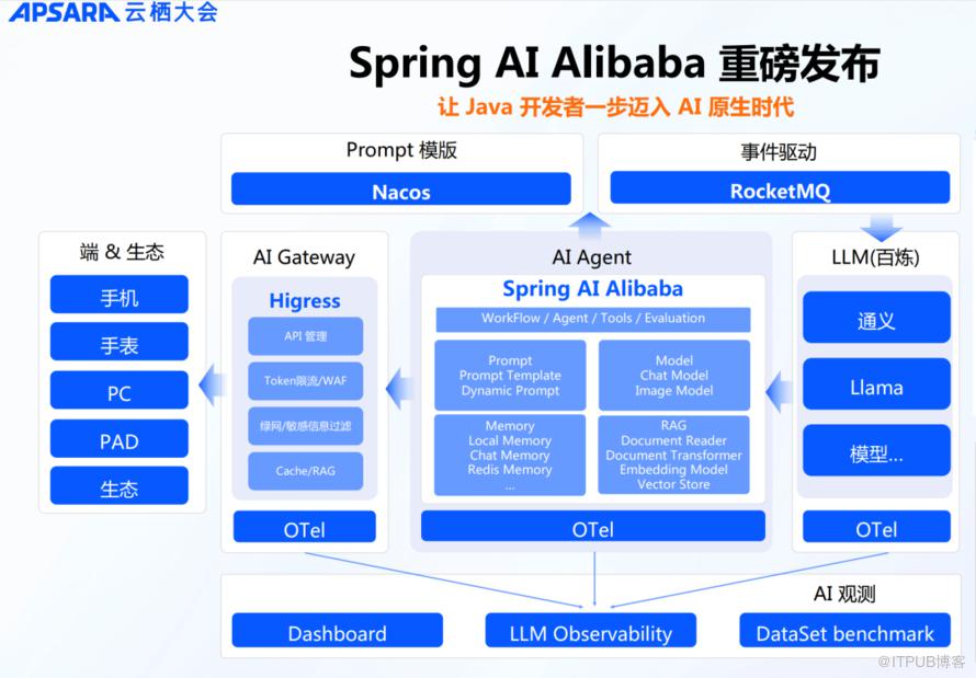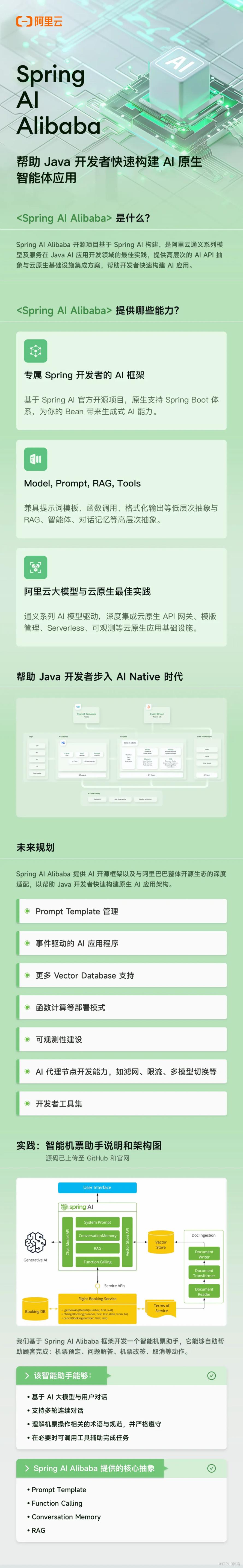 鉴于此,阿里推出了基于 Spring AI 的 Spring AI Alibaba,旨在通过便捷的API 抽象,助力 Java 开发者轻松构建 AI 应用。同时,我们还提供了全面的开源支持,涵盖可观测监控、网关、消息队列、配置中心等全方位功能。