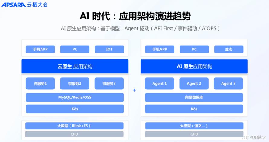 应用程序架构经历了从单体架构到 LAMP 架构,再到 SOA架构、微服务架构,最终发展到云原生架构的演变。在下面的图中,左侧展示了一个典型的云原生应用架构,它集成了容器技术、微服务架构和声明式 API。在这个架构中,微服务根据业务模块的需求进行了拆分,并对架构进行了无状态化改造,将数据存储任务交由数据库处理;微服务在容器中运行,实现了按需伸缩,极大地提升了研发效率和运维能力。