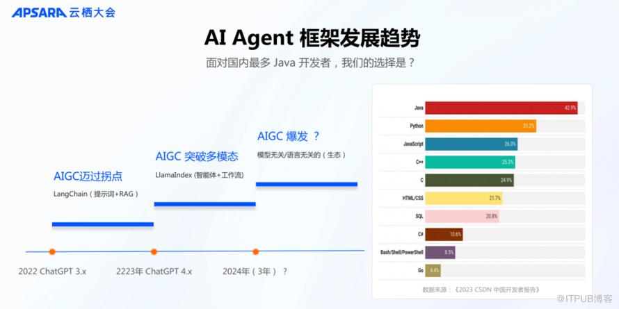 3. 成熟阶段:2024年,伴随着多模态技术的进步,模型能力不断突破。在过去两年中,主流框架以 Python 为主,但对于中国占比42.9%的 Java 开发者来说,他们面临的选择是:是转向Python开发,还是编写Java版的LangChain/LlamaIndex,或是基于 Spring 框架来构建AI应用?