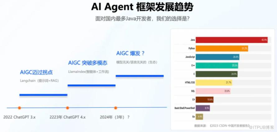 3. 成熟阶段:2024年,伴随着多模态技术的进步,模型能力不断突破。在过去两年中,主流框架以 Python 为主,但对于中国占比42.9%的 Java 开发者来说,他们面临的选择是:是转向Python开发,还是编写Java版的LangChain/LlamaIndex,或是基于 Spring 框架来构建AI应用?