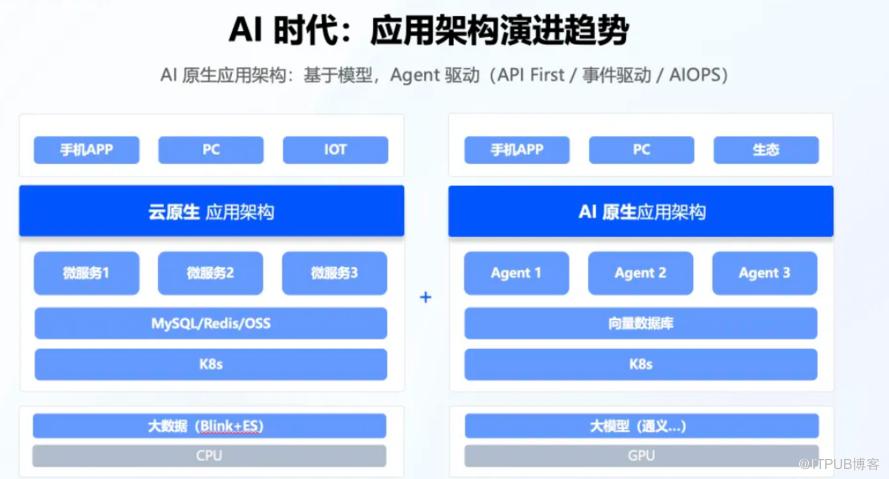 应用程序架构经历了从单体架构到 LAMP 架构,再到 SOA架构、微服务架构,最终发展到云原生架构的演变。在下面的图中,左侧展示了一个典型的云原生应用架构,它集成了容器技术、微服务架构和声明式 API。在这个架构中,微服务根据业务模块的需求进行了拆分,并对架构进行了无状态化改造,将数据存储任务交由数据库处理;微服务在容器中运行,实现了按需伸缩,极大地提升了研发效率和运维能力。