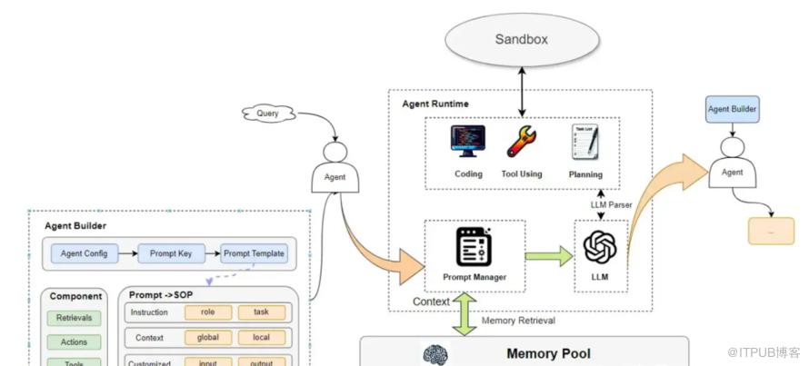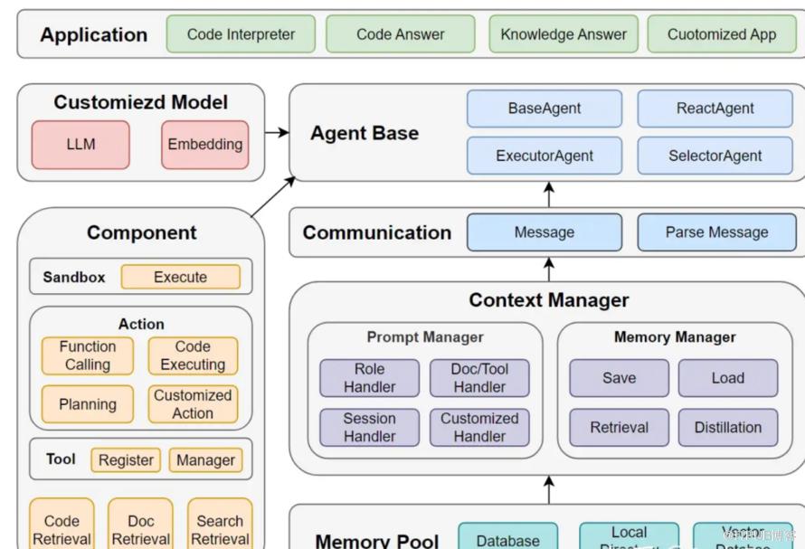 Agent Base:构建了四种基本的 Agent 类型 BaseAgent、ReactAgent、ExecutorAgent、SelectorAgent,支撑各种场景的基础活动。 Communication:通过 Message 和 Parse Message 实体完成 Agent 间的信息传递,并与 Memory Manager 交互再 Memory Pool 完成记忆管理。 Prompt Manager:通过Role Handler、Doc/Tool Handler、Session Handler、Customized Handler,来自动化组装Customized 的Agent Prompt。 Memory Manager:用于支撑 chat history 的存储管理、信息压缩、记忆检索等管理,最后通过 Memory Pool 在数据库、本地、向量数据库中完成存储。 Component:用于构建 Agent 的辅助生态组件,包括 Retrieval、Tool、Action、Sandbox 等。 Customized Model:支持私有化的 LLM 和 Embedding 的接入。