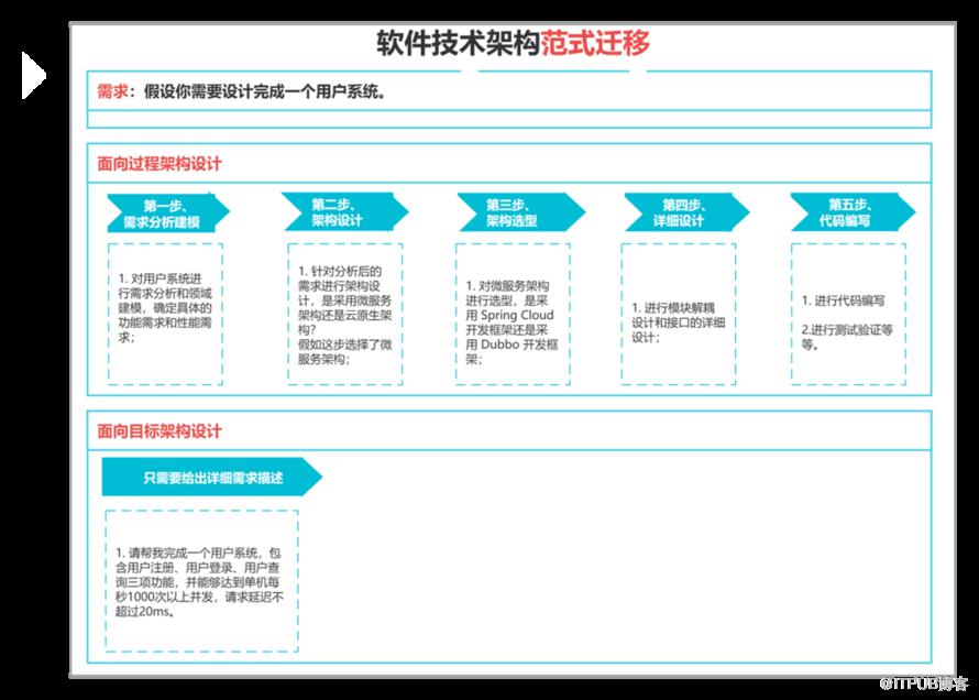 移动互联网时代,软件架构主流的设计模式是面向过程架构设计:按照预定义的规则和流程来研发软件。而在 AI 大模型时代,软件架构范式会从面向过程架构设计演变为面向目标架构设计:目标导向,动态规划。这两种架构设计模式到底有什么本质区别,我们先来看一个案例:假设你需要设计完成一个用户系统(如下图所示)。第一步、对用户系统进行需求分析和领域建模,确定具体的功能需求和性能需求;第二步、针对分析后的需求进行架构设计,是采用微服务架构还是云原生架构?假如这步选择了微服务架构;第三步、对微服务架构进行选型,是采用 Spring Cloud 开发框架还是采用 Dubbo 开发框架;第五步、进行业务代码、测试代码、自动运维部署代码等编写;你只需要给出你的详细需求:请帮我完成一个用户系统,包含用户注册、用户登录、用户查询三项功能,并能够达到单机每秒5000次以上并发,请求延迟不超过 30ms。稍等片刻,“ AI 大模型”就能帮你完成任务。