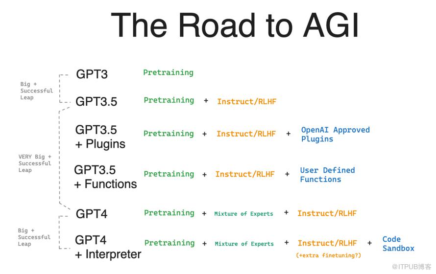 2023年,OpenAI 开放了 Plus 会员的体验资格,Code Interpreter 是 GPT 的一次重大升级,被认为是可以称为 GPT-4.5 的一次改动。到目前为止,在生成式 AI 的短暂历史中,我们已经有了一些值得注意的案例研究。虽然 GPT-1→2→3 的进展,每次都有一个明确的进步。但在扩散模型,比如:Stable Diffusion 1→2 则更具争议。如今,GPT 是以0.5个版本单位进化的。你可能还记得,GPT-3.5 是与ChatGPT 一起发布的,还包括 text-davinci-003 和 code-davinci-002(它们与 gpt-3.5-turbo 一样,都属于 GPT-3.5 系列模型)。这种版本号命名方式,有两点值得注意:第一,它提醒了人们,GPT-3.5 模型明显优于 GPT-3,因为增加了代码,进行了指令调优,还有结合了人类反馈和强化学习算法的 RLHF/PPO 技术;第二,这种新的聊天范式,是通用人工智能的前进方向。今天的 Code Interpreter(代码解释器)模型,同样符合这两点分析框架:第二,这种新范式是通用人工智能的前进方向(如下图)。这就将引出这样一个结论:Code Interpreter应该被视为事实上的 GPT 4.5。如果未来它有了 API,我打赌,它也会追溯获得版本号命名。今晚我们就详细剖析下 Code Interpteter 的技术架构,请同学点击下方按钮预约直播。 —2—