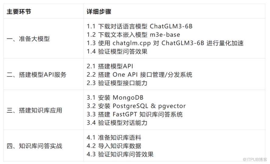 基于 MacBook 的部署方案分为四个主要环节、14个具体步骤,只要一步步实操下去,每位 IT 同学都可以在自己的 MacBook 上拥有属于自己的私有大模型知识库系统,步骤清单如下: