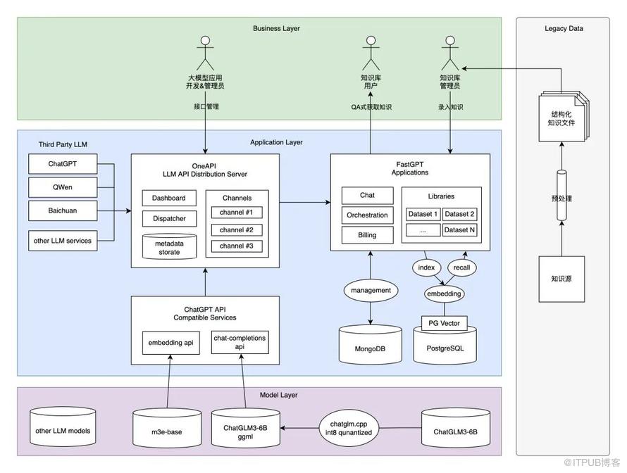 基于一台 MacBook 搭建部署的架构设计如下图,在这套架构设计中,我们采用了实力排上游、并且对企业和学术都友好的国产开源大模型 ChatGLM3-6B。并采用了基于 m3e-base 模型的 embedding search RAG 方案。基于这两个模型封装和 ChatGPT 兼容的 API 接口协议;通过引入 One API 接口管理 & 分发系统,形成统一 LLM 接口渠道管理平台规范,并把封装好的接口协议注册进去;搭建与 Dify.ai 齐名开源大模型知识库平台管理系统 FastGPT,实现集私有知识数据源预处理、嵌入检索、大模型对话一体的完整知识库应用流程。麻雀虽小五脏俱全,最终形成一套既满足商用标准、又能在 MacBook 跑起来的的方案。虽然智能程度和实际需求还有一定差距,但至少我们在不用额外购买显卡或云服务的情况下,以最小成本部署运行、并且能导入实际业务数据(如:设计文档、业务流程文档、项目管理文档、技术分享文档等等)进行实操验证,值得每位工程师都来动手尝试一下。更详细的架构设计剖析,今晚20点直播详细剖析,请同学点击下方按钮预约直播。 —3—