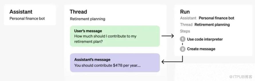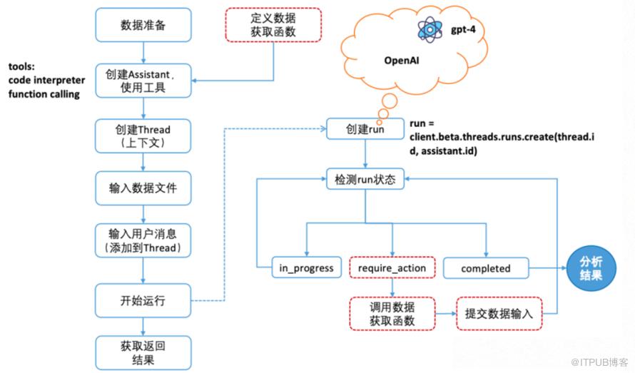 这里有3个核心概念 Assistant、Thread、Run。Assistant 代表了 AI 助理,Thread 则代表 Assistant 与用户的会话,Run 则是一次“人机交互”。在 Assistants API 的使用中,理论上是一个异步的调用过程。提交一个 Run后,通过 API 轮询状态,直到完成再获取/检索 Assistants 的消息,也就是通常所说的大模型的回答。Assistant 一个具体指令(instructions),可以利用大模型、工具(tools)和知识来响应用户的查询。Assistants API 目前支持三种类型的工具(tools):