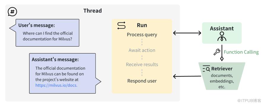 第一、基于向量数据库实现 RAG(Retrieval Augmented Generation)应用RAG 是一种使用企业级私有和实时的数据用来增强 LLM 大模型能力的一种技术,由两个步骤构成:建立向量索引(Indexing)和检索生成(Retrieval and Generation)。建立向量索引(Indexing)由加载外部知识(Load)、切分大文本为小的单元块(Split)、向量存储(Store)三步组成。检索生成(Retrieval and Generation)由向量知识库检索最相似的 TopK 记录(Retrieve)和 LLM 大模型生成结果(Generate)两步构成。总体来讲,分为离线建立向量数据部分和在线相似度增强和检索部分,如下图所示。第二、使用 OpenAI Assistants 实现 RAG 应用乍一看,OpenAI Assistants 自带的检索功能十分强大,但如果对行业足够了解,便会发现其仍存在诸多限制。OpenAI Assistants 检索严格限制了数据规模,且缺乏定制化的能力。因此,搭建高效的应用还需要使用自定义的检索器。所幸,OpenAI 的函数调用能力允许开发者无缝接入自定义的检索器,从而打破对于知识库数据量的限制,更好地适应多样化的用例。我们可以使用 Milvus 实现 OpenAI Assistants 检索定制化。Milvus 是一款高度灵活、可扩展的开源向量数据库,毫秒内即可实现十亿级别向量的存储和检索。由于优秀的扩展性和超低的查询延时,Milvus 是定制 OpenAI Assistants 检索的首选,下图为 OpenAI Assistant 函数调用通用的工作原理。更多落地实现细节,今晚20点的直播中详细剖析,请同学们点击免费预约。总之,掌握好基于向量数据库的 RAG 业务应用落地实现,对于 IT 人来说是一项非常重要的技能—3—