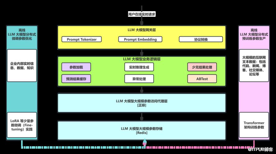 LLM 大模型整体架构由离线和在线两部分构成(架构如下图所示),离线部分主要是基于 Transformer 架构的预训练(Pre-training)和微调(Fine-tuning),在线部分核心是在线工程推理架构。在线工程推理架构负责根据用于输入的 Prompt 提示词(比如:双12马上到了,应该给程序员提供什么样的学习福利?)给出准确的答复(比如:AIGC 学习计划)。第一步:LLM 大模型网关层收到用户的 Prompt(比如:双12马上到了,应该给程序员提供什么样的学习福利?),把 Prompt 进行 Tokenizer 分词,并编码成对应的 Token(比如:“双12”对应 token 为 88、“马上”对应 token 为 1205、“到了”对应 token 为 2024 等等),进一步把 tokens Embedding 成对应的向量(比如:采用 ChatGPT 的 text-embedding-ada-002 模型来向量化,每个 token 生成 1536 维的向量)。第二步:LLM 大模型业务逻辑层接收到 LLM 大模型网关层的 Request 请求(向量数据),对接收到的向量数据基于 Transformer 架构进行自回归推理,不断预测出下一个 token,直到预测出 EOS(End Of Sentence)结束符,比如:针对上一步的预测答复为:AIGC 学习计划。LLM 大模型业务逻辑层除了完成自回归的结果实时预测生成外,还需要加载大模型海量的参数(比如:GPT 3 有 1750 个 Float 参数组成,需要 700G的显存)、预测结果缓存、少无结果处理、异常处理以及 ABTest。