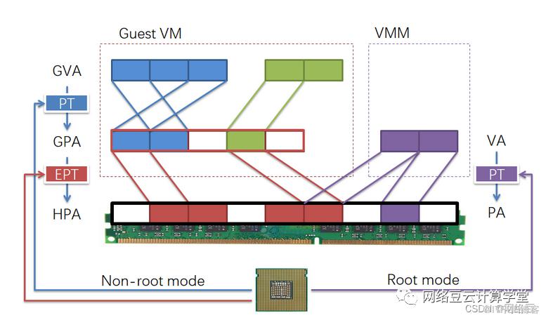 内存虚拟化技术会在物理内存的基础上创建一个虚拟的内存层,这个虚拟内存层可以被切分成多个虚拟内存空间,每个虚拟内存空间都可以被分配给一个虚拟机。