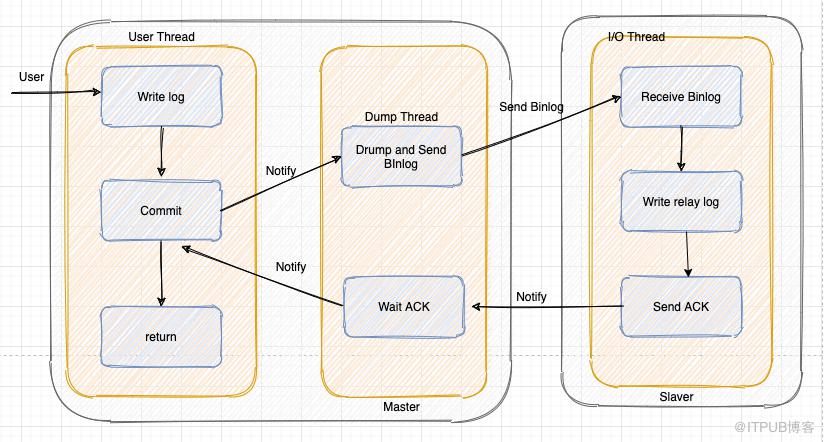 介于异步复制和全同步复制之间,主库在执行完客户端提交的事务后不是立刻返回给客户端,而是等待至少一个从库接收到并写到 relay log 中才返回成功信息给客户端(只能保证主库的 Binlog 至少传输到了一个从节点上),否则需要等待直到超时时间然后切换成异步模式再提交。