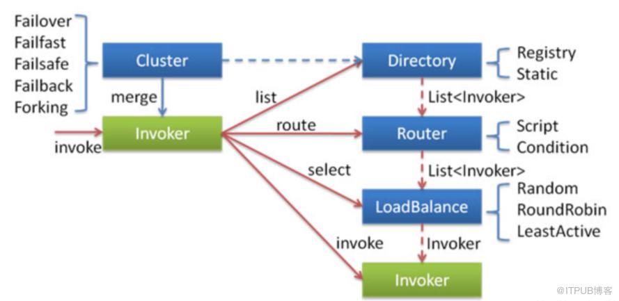 cluster 路由层:封装多个提供者的路由及负载均衡,并桥接注册中心,以 Invoker 为中心,扩展接口为 Cluster, Directory, Router, LoadBalance