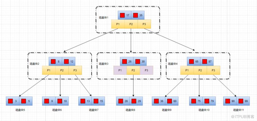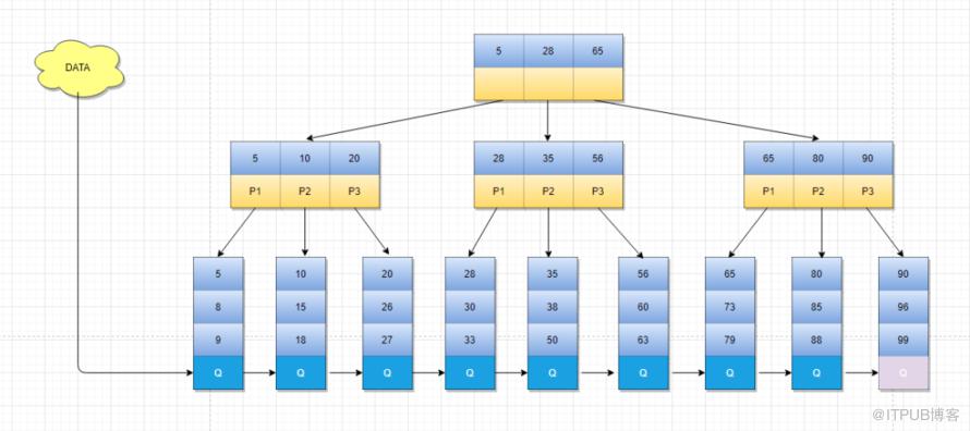 2. 所有的叶子结点中包含了全部关键字的信息,及指向含有这些关键字记录的指针,且叶子结点本身依关键字的大小自小而大的顺序链接。(B-tree 的叶子节点并没有包括全部需要查找的信息)