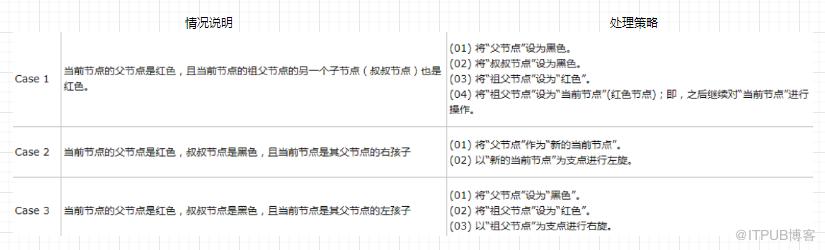 当被插入的节点的父节点是红色。这种情况下,被插入节点是一定存在非空祖父节点的;进一步的讲,被插入节点也一定存在叔叔节点(即使叔叔节点为空,我们也视之为存在,空节点本身就是黑色节点)。理解这点之后,我们依据"叔叔节点的情况",将这种情况进一步划分为 3 种情况(Case)。