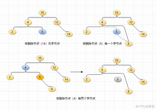 删除操作主要分为三种情况,即要删除的节点无子节点,要删除的节点只有一个子节点,要删除的节点有两个子节点。