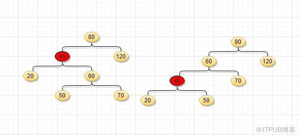 2. 被删除节点只有一个儿子。那么,直接删除该节点,并用该节点的唯一子节点顶替它的位置。
