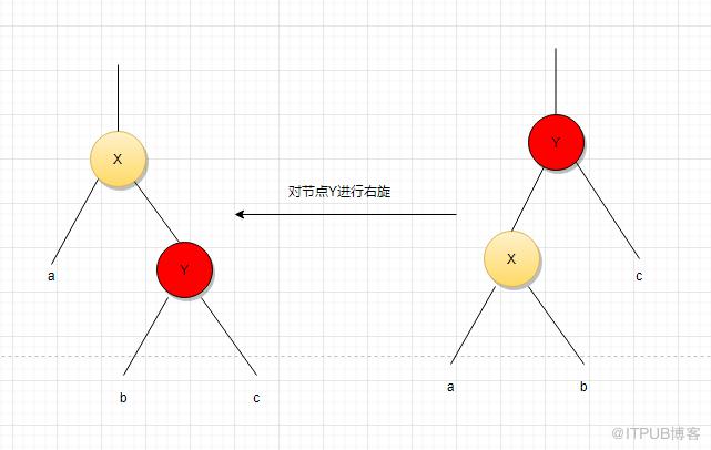 对 x 进行右旋,意味着,将“x 的左孩子”设为“x 的父亲节点”;即,将 x 变成了一个右节点(x成了为 y 的右孩子)!因此,右旋中的“右”,意味着“被旋转的节点将变成一个右节点”。