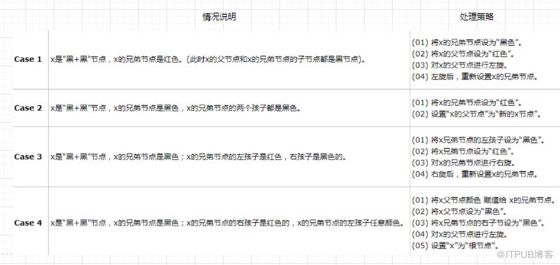 当 x 是“黑+黑”节点,且 x 不是根,这种情况又可以划分为 4 种子情况。这 4 种子情况如下表所示: