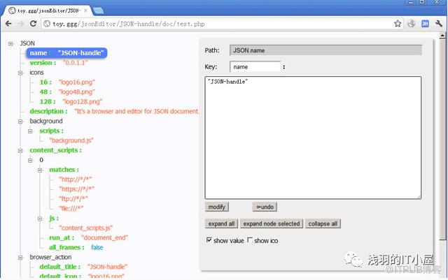对JSON格式的内容进行浏览和编辑,以树形图样式展现JSON文档,并可实时编辑。安装后打开下面网址可以看到JSON-handle启动的效果: