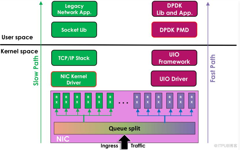 处理路径:Linux协议栈处理路径长,多核扩展性不足,系统调用开销大。