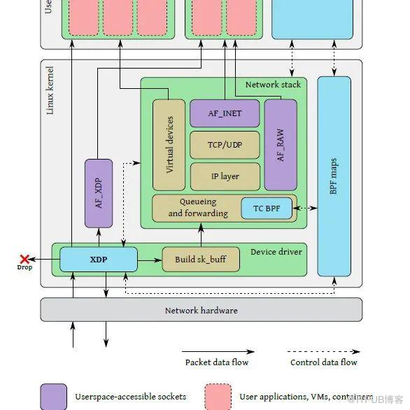由于其灵活性和实用性,eBPF 的钩子数量正在激增。但是,我们将重点关注数据路径低端的那些。这里的关键区别在于 eBPF 在驱动程序空间中添加了一个额外的钩子。此挂钩称为 eXpress DataPath,或 XDP。这允许用户在将 skb(套接字缓冲区)元数据结构添加到数据包之前丢弃、反射或重定向数据包。性能可以提高约 4-5 倍。
