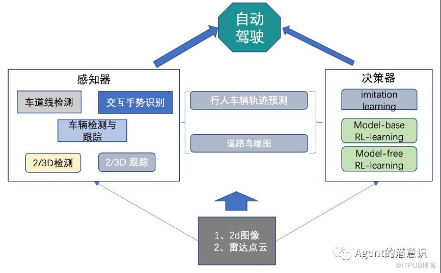 我给大家画了一个框架图。我的框架图着重点不在整个pipeline,重点落在了整个pipeline中的技术点上了。目前做一个完整的自动驾驶车辆,都用哪些方法,触及了哪些细分研究领域。这些都是你搜索论文的入口。