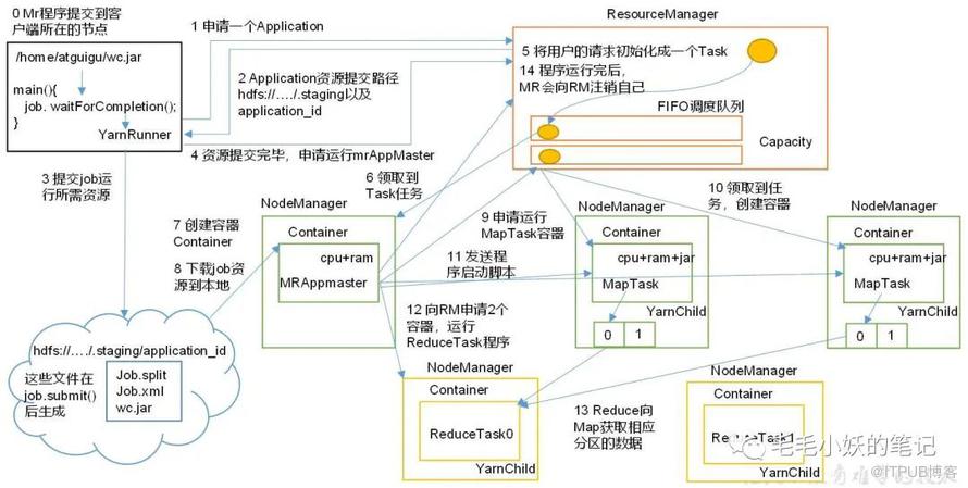 client 向 RM(Resource manager) 发起请求,RM 将提交的作业封装成 Task,并为 client 返回一个 JOB ID 和资源上传的路径。此时 JOB 的状态为:NEW。 client 继续将任务所需的依赖和配置文件提交给 RM 指定的资源路径,RM 会将这些信息保存下来。此时 JOB 的状态为:SUBMIT。 client 提交完资源后,会向 RM 申请运行 Application Master。 RM 收到请求后,将作业信息提交给 Scheduler 来调度,Scheduler 会检查 Application Master 对应的队列是否有足够的资源。此时 JOB 的状态为:ACCEPT。 某个 NM 分配到任务后,RM 为 AM(Application Master) 创建运行所需的 Container,并启动 AM。此时 JOB 的状态为:RUNNING。 AM 启动后,会向 RM 申请资源,并对任务进行监控。如果任务正常结束,状态为:FINISHED,如果运行失败,状态为:FAILED,如果用户手动终止任务,状态为:KILLED。