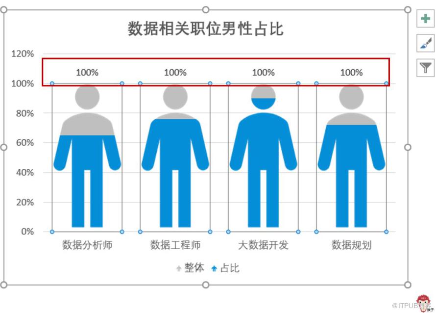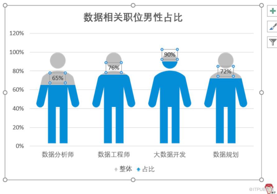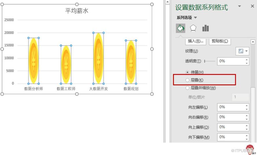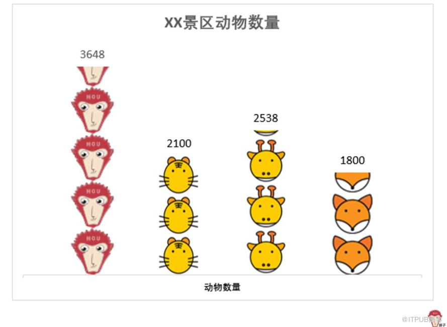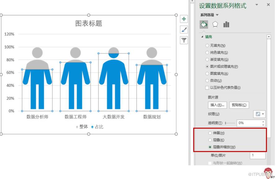 如上图所示,图标被拉伸变形了。怎么办?单击任一图标,在【设置数据系列格式】窗口里,将填充方式勾选为【层叠】。效果如下图: