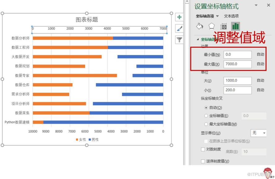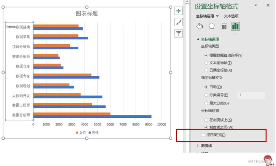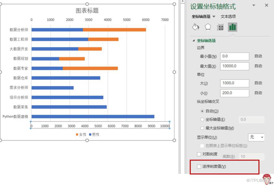 选中下方的横坐标轴,将其设置为【逆序刻度值】。男性的数据就这样被掰过来了。