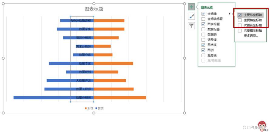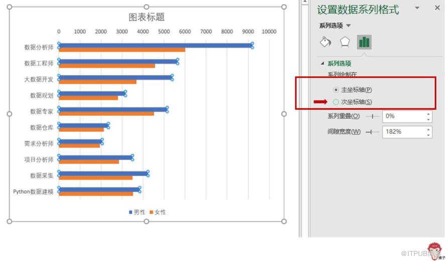 选中男性的数据(蓝色柱形图),把它设置为【次坐标轴】。