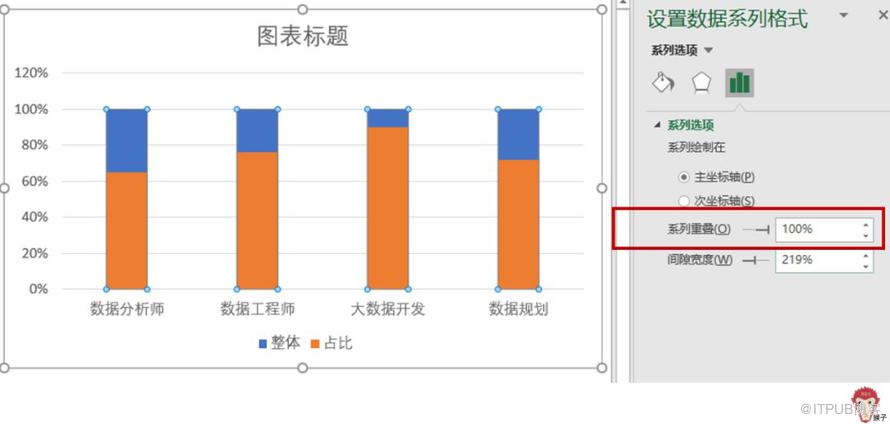 单击任一柱形图,然后在【设置数据系统格式】窗口里,将【系列重叠】调为100%,那么,两个系列的柱形就会完全重叠在一起,形成百分比重叠型柱形图。