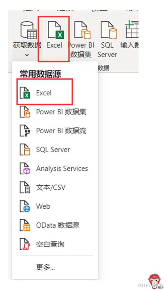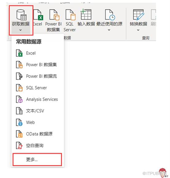 打开PowerBI Desktop 页面,从功能栏上点击“获取数据”,选择“更多”。