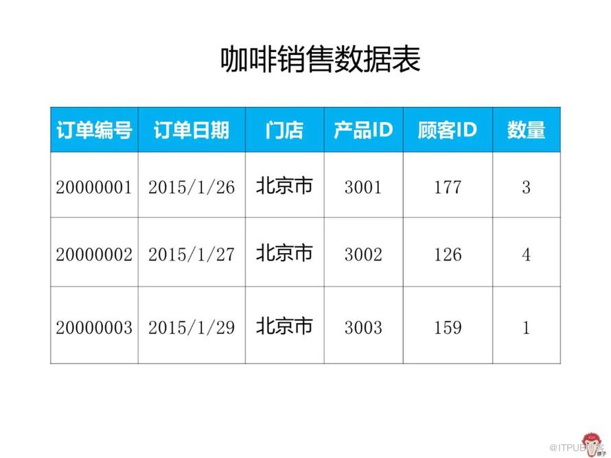 下面的案例Excel表里记录了咖啡销售数据。表中含有的字段:订单编号、订日期、门店、产品ID、顾客、数量。(公众号回复“资料”下载案例数据)