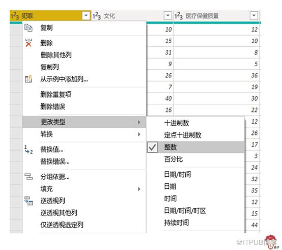选中要编辑的列名,鼠标右键,可以出现:从表中删除列、以新名称复制列或替换值。通过此菜单,还可以更改数据类型。