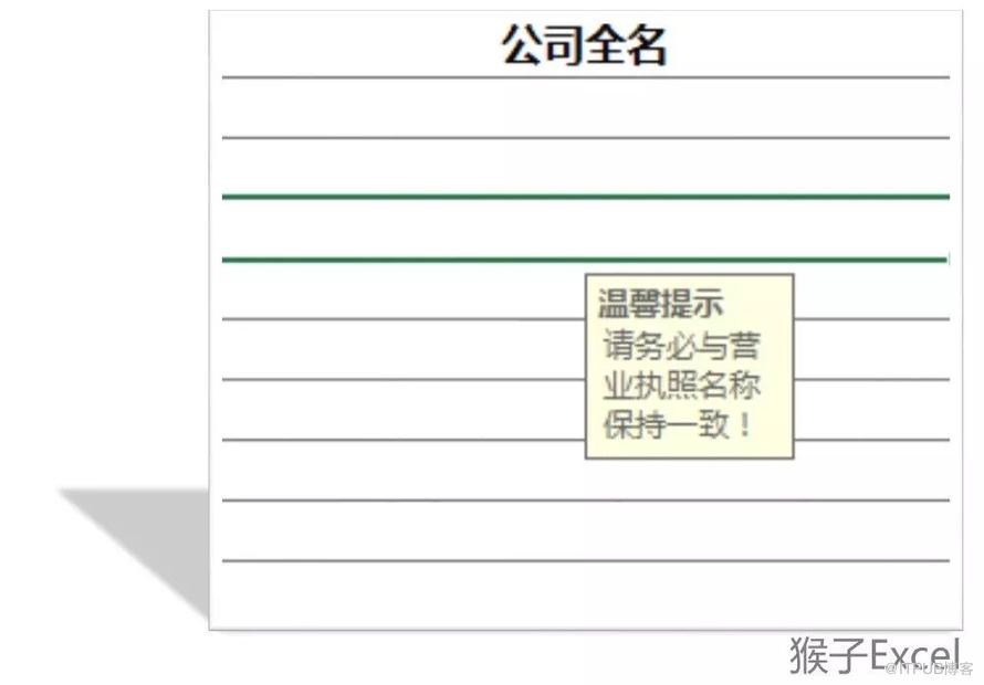 案例数据的“公司全名”这一列,我想要提醒填写表格的人一定要写全名啊,如果你还是不写全名,我也不会把你怎么样,我只能再想一种办法提醒你。