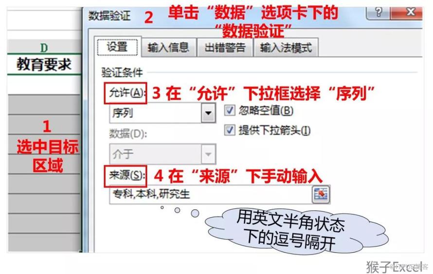 本以为简单的学历填写,竟有这么多戏。让“数据验证”来帮忙,限制可选择的内容只能是“专科、本科、研究生”。