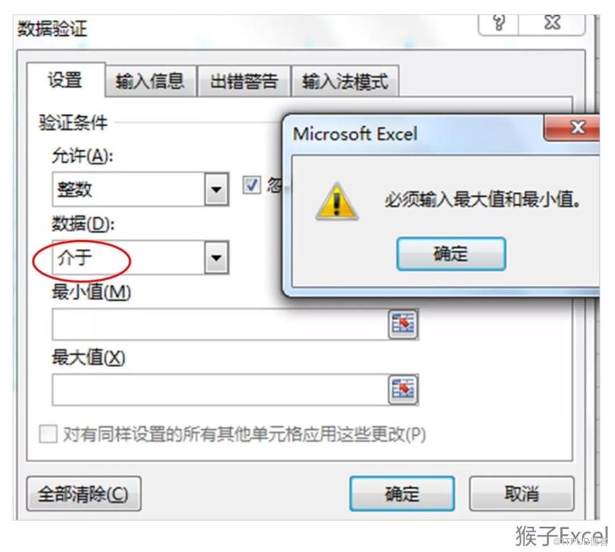 这里“允许”下拉框选择“整数”后,“数据”会默认“介于”,出现“介于”的情况下,必须输入最大值和最小值,以控制数据的范围,如下图所示