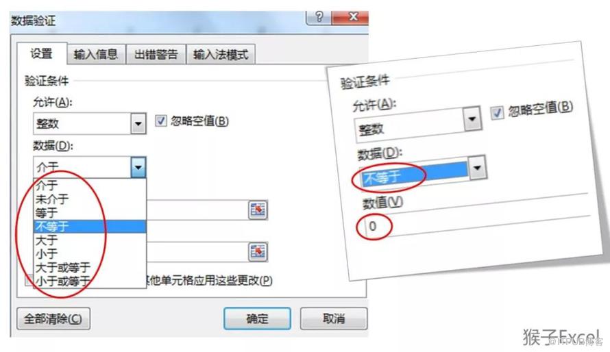 如果你不想输入最大值和最小值的话,可以在“数据”下拉框中选择其他选项,这里我们选择“不等于”,在“数值”处输入“0”即可。