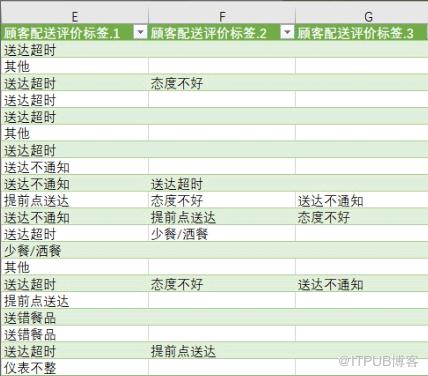 通过在Excel中分列功能对“顾客配送评价标签”这一列处理,得到下面的几列。