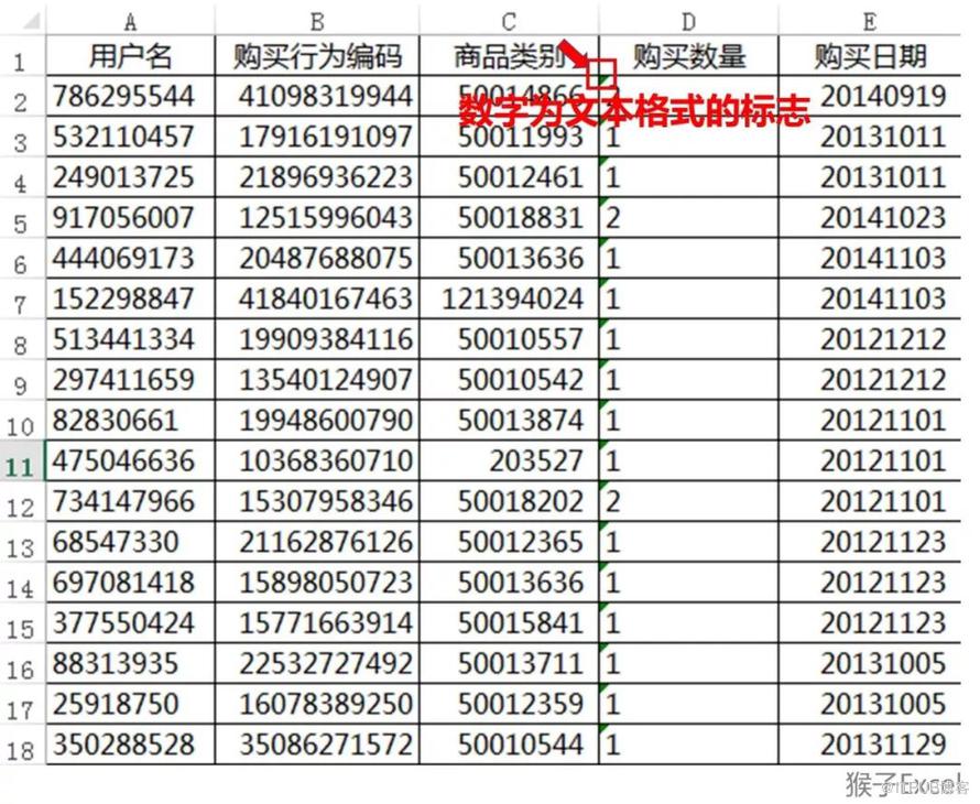 这个案例里的“用户名”、“商品类别”列里的数字并无大小含义,无需运算处理,所以我们要将其处理为文本格式。