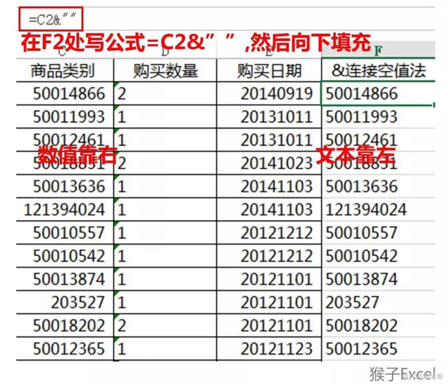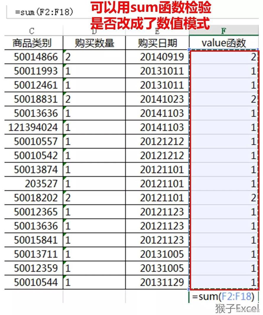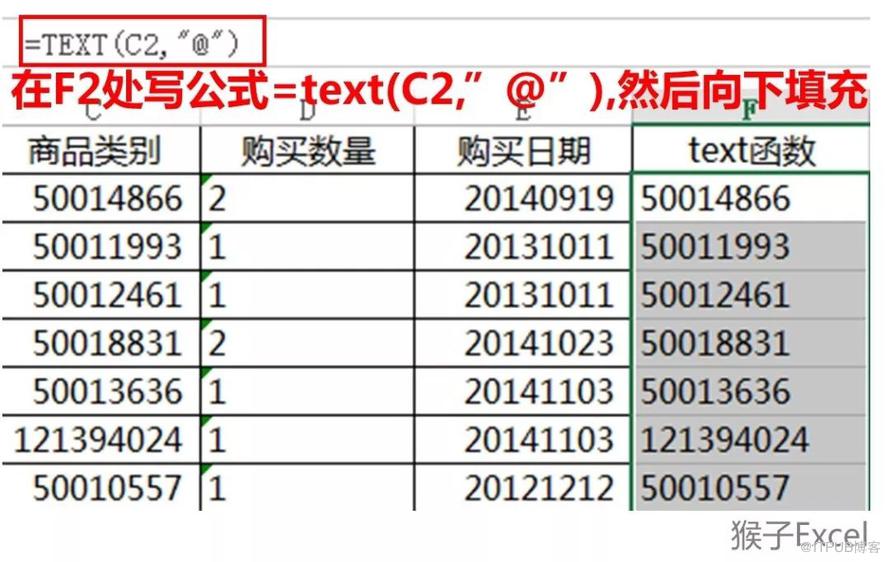 借助辅助列F列,在F2单元格输入=text(C2,"@") 其中@代表文本格式。下面图片是把“商品类别”的数字处理为文本格式。